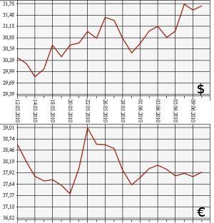 Центробанк на 10 июня 2010 года повысил курс доллара США к рублю до 31,7302 рубля, курс евро - до 37,9430 рубля. На торгах ЕТС ММВБ средневзвешенный курс доллара с расчетами "завтра" упал до 31,7565 рубля, курс евро - вырос до 38,0171 рубля.