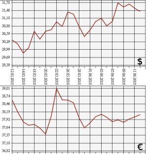 Центробанк на 12 июня 2010 года понизил курс доллара США к рублю до 31,4471 рубля, а курс евро - повысил до 38,0982 рубля. На торгах ЕТС ММВБ средневзвешенный курс доллара с расчетами "завтра" упал до 31,4505 рубля, курс евро - до 38,1035 рубля.