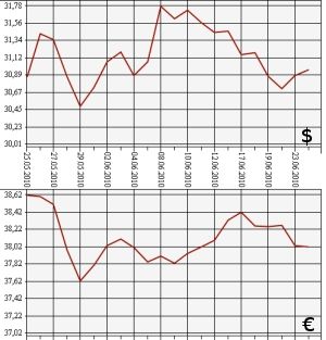 Результаты единой торговой сессии межбанковской валютной биржи показали несколько иную динамику. По итогам торгов ЕТС на ММВБ 23 июня средневзвешенный курс доллара США с расчетами "завтра" увеличился более чем на 7 копеек - с 30,9306 рубля до 31,0076 рубля. Евро на торгах подорожал почти на 4 копейки, с 38,0472 рубля до 38,0861 рубля.