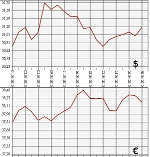 По информации ЦБ РФ, на 30 июня официальный курс доллара США к рублю повышен более чем на 21 копейку - с 30,9833 рубля до 31,1954 рубля. Официальный курс евро составил 38,1863 рубля, что почти на 13 копеек ниже предыдущей цены - 38,3139 рубля 29 июня.