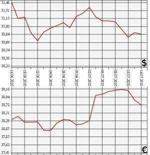 Банк России на 14 июля 2010 года понизил курс доллара США к рублю до 30,8543 рубля, курс евро - до 38,7345 рубля. На торгах ЕТС ММВБ средневзвешенный курс доллара с расчетами "завтра" упал до 30,8133 рубля, курс евро - до 38,7059 рубля.