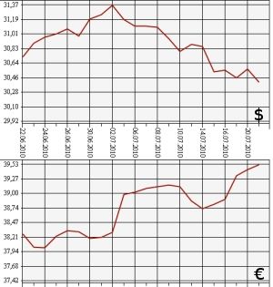 Банк России на 21 июля 2010 года понизил курс доллара США до 30,4058 рубля, а курс евро к рублю повысил - до 39,5306 рубля. На торгах ЕТС ММВБ средневзвешенный курс доллара с расчетами "завтра" упал до 30,4630 рубля, курс евро - до 39,4231 рубля.