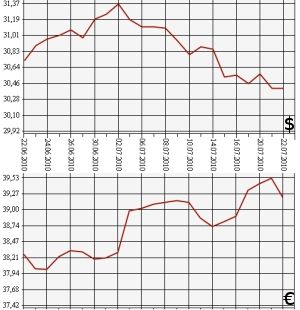 Банк России на 22 июля 2010 года повысил курс доллара США к рублю до 30,4059 рубля, курс евро понизил до 39,2145 рубля. На торгах ЕТС ММВБ средневзвешенный курс доллара с расчетами "завтра" упал до 30,4308 рубля, курс евро - до 39,1048 рубля.