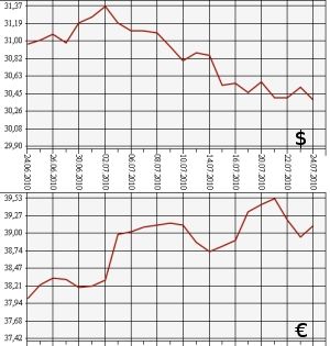 Центрабанк на 24 июля 2010 года понизил курс доллара США до 30,3839 рубля, а курс евро к рублю повысил - до 39,1253 рубля. На торгах ЕТС ММВБ средневзвешенный курс доллара с расчетами "завтра" упал до 30,3538 рубля, курс евро вырос до 39,1923 рубля.