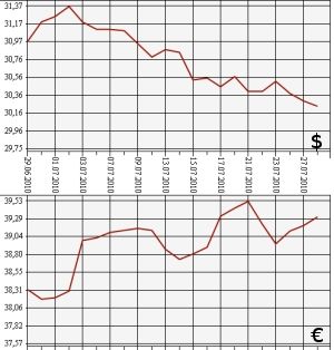 Банк России на 28 июля 2010 года повысил курс евро к рублю до 39,3139 рубля, а курс доллара США понизил - до 30,2391 рубля. На торгах ЕТС ММВБ средневзвешенный курс евро с расчетами "завтра" вырос до 39,3166 рубля, курс доллара упал до 30,2285 рубля.