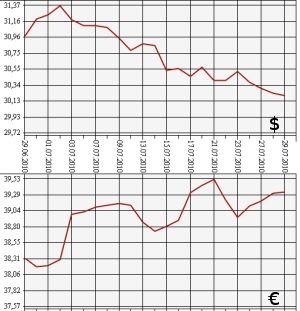 Банк России на 29 июля 2010 года понизил курс доллара США - до 30,2066 рубля, курс евро к рублю повысил - до 39,3350 рубля. На торгах ЕТС ММВБ средневзвешенный курс с доллара расчетами "завтра" упал до 30,2282 рубля, евро - до 39,3126 рубля.