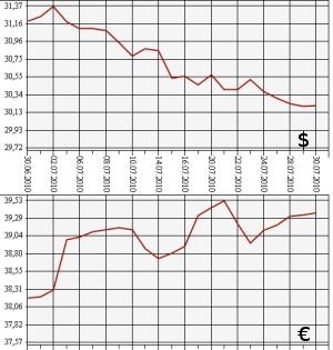 Центробанк РФ на 30 июля 2010 года повысил курс доллара США к рублю до 30,2173 рубля, а курс евро - до 39,3671 рубля. На торгах ЕТС ММВБ средневзвешенный курс с доллара расчетами "завтра" упал до 30,1921 рубля, евро вырос - до 39,4255 рубля.