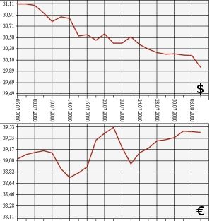 Центробанк на 4 августа 2010 года понизил курс доллара США к рублю до 29,9681 рубля, курс евро - до 39,4500 рубля. На торгах ЕТС ММВБ средневзвешенный курс доллара с расчетами "завтра" уменьшился до 29,8322 рубля, евро - до 39,4382 рубля.