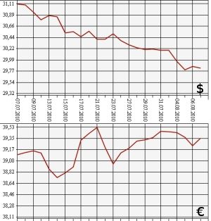 Банк России на 7 августа 2010 года повысил курс евро к рублю до 39,3593 рубля, а курс доллара США понизил - до 29,8312 рубля. На торгах ЕТС ММВБ средневзвешенный курс евро с расчетами "завтра" вырос до 39,3559 рубля, курс доллара - до 29,8357 рубля.