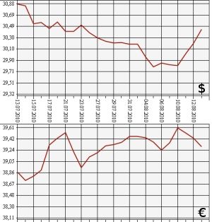 Центробанк на 13 августа 2010 года повысил курс доллара США до 30,4493 рубля, а курс евро к рублю понизил - до 39,3009 рубля. На торгах ЕТС ММВБ средневзвешенный курс доллара с расчетами "завтра" вырос до 30,5307 рубля, курс евро уменьшился - до 39,2538 рубля.