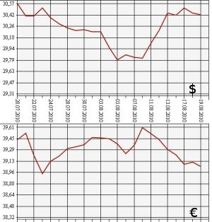 Центробанк на 19 августа 2010 года понизил курс евро к рублю до 39,0514 рубля, а курс доллара США - до 30,4257 рубля. На торгах ЕТС ММВБ средневзвешенный курс евро с расчетами "завтра" опустился до 39,1327 рубля, курс доллара - до 30,4003 рубля.