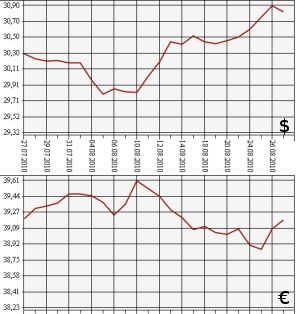 Центробанк на 27 августа 2010 года понизил курс доллара США до 30,8227 рубля, а курс евро к рублю повысил до 39,1911 рубля. На торгах ЕТС ММВБ 26 августа средневзвешенный курс доллара с расчетами "завтра" упал до 30,8077 рубля, курс евро вырос до 39,1376 рубля.По данным ЦБ РФ, на 27 августа официальный курс доллара США к рублю понижен более чем на 7 копеек - с 30,8958 рубля 26 августа до 30,8227 рубля. Официальный курс евро, напротив, повышен - более чем на 10 копеек, с 39,0894 рубля до 39,1911 рубля.