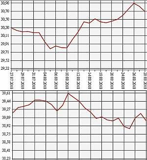 Банк России на 28 августа 2010 года понизил официальный курс доллара США по отношению к рублю до 30,7026 рубля, а курс евро - до 30, 0483 рубля. На торгах ЕТС ММВБ средневзвешенный курс доллара США с расчетами "завтра" понизился до 30,7026 рубля, а евро - до 39,0483 рубля.По данным ЦБ РФ на 28 августа официальный курс доллара США упал более чем на 12 копеек - с 30,8227 рубля до 30,7026 рубля, а курс евро - более чем на 14 копеек - с 39,1911 рубля до 39,0483 рубля. Соответственно, стоимость бивалютной корзины (0,45 евро и 0,55 доллара) понизилась на 13 копеек до 34,453 рубля - с 34,5885 рубля на 27 августа.