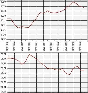 Результаты единой торговой сессии межбанковской валютной биржи показали аналогичную динамику. По итогам торгов ЕТС на ММВБ средневзвешенный курс доллара США с расчетами "завтра" составил 30,6838 рубля, что более чем на 1 копейку меньше результата предыдущих торгов - 30,7026 рубля. Средневзвешенный курс евро с расчетами "завтра" также понижен на 1 копейку - с 39,0483 рубля накануне до 39,0353 рубля.