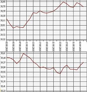 По данным ЦБ РФ на 3 сентября 2010 года официальный курс доллара США опустился более чем на 11 копеек - с 30,8001 рубля до 30,6858 рубля, а курс евро - вырос более чем на 12 копеек - с 39,1654 рубля до 39,2901 рубля. Соответственно, стоимость бивалютной корзины (0,45 евро и 0,55 доллара) понизилась менее чем на 1 копейку (-0,02%) до 34,5577 рубля - с 34,5645 рубля на 2 сентября.