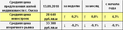 По данным журнала "Недвижимость", средняя цена квадратного метра жилья на вторичном рынке на 13 сентября 2010 года составила 33 тысячи 380 рублей, потеряв за неделю 80 рублей (-0,2%). Коррекция меньше погрешности (140 рублей или 0,4%), т.е. по правилам статистики цена практически не изменилась.