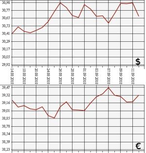 Банк России на 14 сентября 2010 года понизил курс доллара США к рублю до 30,6831 рубля, а курс евро повысил - до 39,3235 рубля. На торгах ЕТС ММВБ средневзвешенный курс доллара с расчетами "завтра" упал до 30,7056 рубля, евро вырос - до 39,3474 рубля.По информации ЦБ РФ, на 14 сентября официальный курс доллара США к рублю понижен более чем на 21 копейку - с 30,8937 рубля до 30,6831 рубля. Официальный курс евро, напротив, увеличен - до 39,3235 рубля. Это на 13 с лишним копеек выше предыдущей цены (39,1917 рубля 11 сентября).