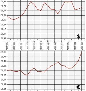 Банк России на 16 сентября 2010 года повысил курс евро к рублю до 39,9107 рубля, а курс доллара США - до 30,7407 рубля. На торгах ЕТС ММВБ средневзвешенный курс евро с расчетами "завтра" вырос до 39,9852 рубля, курс доллара - до 30,8200 рубля.По информации ЦБ РФ, на 16 сентября официальный курс евро повышен сразу на 38 копеек с лишним - с 39,5264 рубля до 39,9107 рубля. Это самый высокий уровень евро к рублю за последние полгода. Официальный курс доллара США увеличен не так значительно - всего на 3 копейки с небольшим (против 30,7049 рубля 15 сентября), он составил 30,7407 рубля.