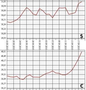 Центробанк на 18 сентября 2010 года повысил курс доллара США до 31,0826 рубля, а курс евро к рублю - до 40,8115 рубля. На торгах ЕТС ММВБ средневзвешенный курс доллара с расчетами "завтра" вырос до 31,0315 рубля, курс евро - до 40,7147 рубля.По данным Банка России, на 18 сентября официальный курс доллара США повышен более чем 6 копеек - с 31,0223 рубля до 31,0826 рубля. Официальный курс евро увеличен значительнее - почти на 50 копеек, с 40,3166 рубля до 40,8115 рубля.