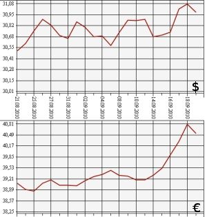 Банк России на 21 сентября 2010 года понизил курс доллара США до 30,9809 рубля, а курс евро к рублю - до 40,5416 рубля. На торгах ЕТС ММВБ средневзвешенный курс доллара с расчетами "завтра" упал до 31,0026 рубля, курс евро - до 40,5806 рубля.По информации ЦБ РФ, на 21 сентября официальный курс доллара США понижен более чем 10 копеек - с 31,0826 рубля до 30,9809 рубля. Официальный курс евро составил 40,5416 рубля, что почти на 27 копеек ниже предыдущей цены (40,8115 рубля 18 сентября).