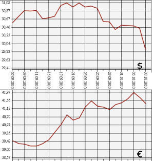 Банк России на 7 октября 2010 года понизил курс доллара США до 29,8929 рубля, а курс евро к рублю - до 41,4017 рубля. На торгах ЕТС ММВБ средневзвешенный курс доллара с расчетами "завтра" упал до 29,8741 рубля, курс евро - до 41,3672 рубля.По информации Центробанка, на 7 октября официальный курс доллара США снижен сразу на 54 копейки с лишним по сравнению с предыдущим уровнем (30,4360 рубля). Впервые за последних два месяца "американец" упал ниже отметки в 30 рублей, его стоимость составила 29,8929 рубля. Официальный курс евро уменьшен более чем на 31 копейку - с 41,7156 рубля до 41,4017 рубля.