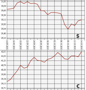 Банк России на 14 октября 2010 года повысил курс евро к рублю до 42,0451 рубля, а курс доллара США - до 30,1269 рубля. На торгах ЕТС ММВБ средневзвешенный курс евро с расчетами "завтра" вырос до 42,0832 рубля, курс доллара упал до 30,1205 рубля.По информации Центробанка, на 14 октября официальный курс евро повышен сразу на 45 копеек с лишним - с 41,5895 рубля до 42,0451 рубля. Выше отметки в 42 рубля "европеец" поднимался последний раз только в начале февраля 2010 года. Официальный курс доллара США составил 30,1269 рубля, что более чем на 5 копеек выше предыдущей цены (30,0763 рубля 13 октября).