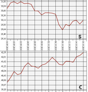 Банк России на 16 октября 2010 года повысил курс доллара США до 30,1243 рубля, а курс евро к рублю - до 42,3939 рубля. На торгах ЕТС ММВБ средневзвешенный курс доллара с расчетами "завтра" вырос до 30,1789 рубля, курс евро - до 42,5016 рубля.По данным Центробанка, на 16 октября официальный курс доллара США повышен более чем на 19 копеек, с 29,9315 рубля до 30,1243 рубля. Официальный курс евро составил 42,3939 рубля, что более чем на 23 копеек выше предыдущего уровня - 42,1585 рубля 15 октября.