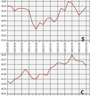 Центробанк на 28 октября 2010 года повысил курс доллара США к рублю до 30,5682 рубля, а курс евро понизил - до 42,1841 рубля. На торгах ЕТС ММВБ средневзвешенный курс доллара с расчетами "завтра" вырос до 30,6071 рубля, курс евро упал до 42,2668 рубля.ЦБ РФ на 28 октября установил официальный курс доллара США на уровне 30,5682 рубля. Это почти на 17 копеек выше предыдущего (30,40 рубля 27 октября). Одновременно официальный курс евро понижен - на 28 копеек с лишним, с 42,4658 рубля до 42,1841 рубля.