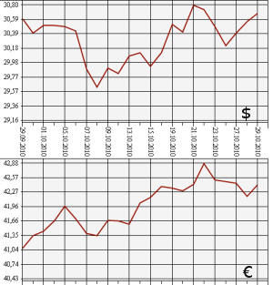 Банк России на 29 октября 2010 года повысил курс евро к рублю до 42,4316 рубля, а курс доллара США - до 30,6786 рубля. На торгах ЕТС ММВБ средневзвешенный курс евро с расчетами "завтра" вырос до 42,5022 рубля, курс доллара - до 30,7134 рубля.По данным Центробанка, на 29 октября официальный курс доллара США повышен на 11 с небольшим копеек - с 30,5682 рубля до 30,6786 рубля. Официальный курс евро достиг до 42,4316 рубля, что почти на 25 копеек выше предыдущей цены (42,1841 рубля 28 октября).