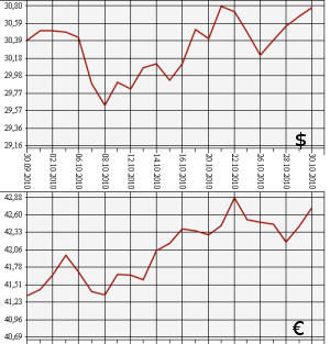 Банк России на 30 октября 2010 года повысил курс курс доллара США к рублю до 30,7821 рубля, а курс евро - до 42,7256 рубля. На торгах ЕТС ММВБ средневзвешенный курс доллара с расчетами "завтра" вырос до 30,8288 рубля, курс евро - до 42,7079 рубля.По информации ЦБ РФ, на 30 октября официальный курс доллара США повышен более чем на 10 копеек - с 30,6786 рубля до 30,7821 рубля. Официальный курс евро увеличен значительнее - на 29 с небольшим копеек, с 42,4316 рубля до 42,7256 рубля.