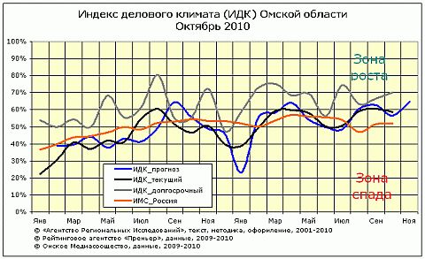 Индекс делового климата (ИДК) в Омске с 2009 года строят совместно рейтинговое агентство "Премьер" и Агентство Региональных Исследований (АРИ). Измеряемый ежемесячно ИДК позволяет с высокой точностью оценить тенденции изменений экономической активности и ее отдельных параметров. Многолетняя практика построения аналогичных индексов в различных странах подтверждает, что ИДК не только обеспечивает высокую точность измерения текущей экономической ситуации, но и обладает высокой прогностической способностью (является т.н. «опережающим индикатором), поскольку способен указывать момент изменения тенденции в объективных количественных характеристиках экономической активности. Значения ИДК выше 50% соответствуют росту, а ниже 50% - падению деловой активности.