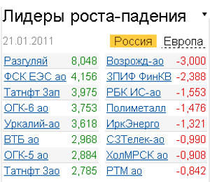 В лидерах роста в пятницу оказались и акции энергетиков: "ФСК ЕЭС" (+4,2%), ОГК-6 (+3,8%). Дорожали акции отечественной нефтянки, за исключением "Газпрома" (-0,77%). Спросом 21 января пользовались бумаги ВТБ (+3%). Хуже рынка торговались "Полюс Золото" (-0,5%), среди аутсайдеров торгов оказались бумаги "РусГидро" (-0,4%).