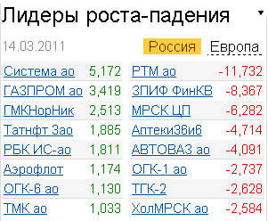 14 марта стало известно, что Банк Японии заявил об инъекции на финансовые рынки $85.5 млрд. "Мы рассчитываем на позитивное влияние действий Банка Японии и заседания ФРС", - отмечает Олег Душин, аналитик ИК "Церих Кэпитал Менеджмент". Завтра игроки будут ждать итогов заседания ФРС США, как ожидается, что процентная ставка будет оставлена без изменений.