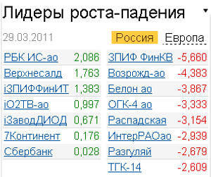 В подобных условиях "голубые фишки" также в едином порыве торговались в "минусе". Наибольшее снижение показали бумаги "Ростелекома" (-2,37%), "Роснефти" (-2,48%), "ЛУКОЙЛа" (-1,6%), "СеверСтали" (-1,63%), "Уралкалия" (-1,19%). При таком тотальном снижение акции "Сбербанка" смогли под конец дня выйти в "плюс" (+0.028%). Павел Корышев, начальник отдела трейдинга ИК "УНИВЕР Капитал", считает, что инвесторы сбрасывают бумаги, опасаясь негативных результатов будущих отчетностей в нефтяных и металлургических компаниях, и, по его мнению, до прихода позитивных новостей движение вниз, вероятно, будет продолжаться.