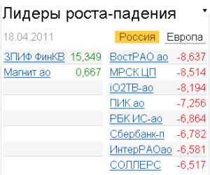 Вслед за рынком российские "голубые фишки" торговались в "красной зоне". Динамику хуже рынка показали бумаги "ГАЗПРОМа" (-3,82%), "СОЛЛЕРСа" (-6,52%) и обыкновенные акции "Сбербанка" (-5,27%). Также одними из лидеров падения были акции "Таттелекома" (-6,1%) и "Разгуляя" (-5,7%), "НорНикеля" (-4,4%).
