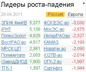 29 апреля индекс ММВБ снизился на 0,45% до 1741.84 пункта, индекс РТС - на 0,1% до 2026.94 пункта. В вечернюю сессию на FORTS июньский фьючерс на индекс РТС прибавил 0,35% и составляет 199885 пунктов. Фьючерс на акции "Сбербанка" растет на 0,12%, фьючерс на акции "ЛУКОЙЛа" - на 0,08%, фьючерс на акции "Газпрома" - на 0,32%.