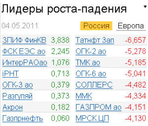 Всеволод Лобов, аналитик ФГ "ДОХОДЪ", считает, что российский рынок падает из-за нехватки ликвидности, вызванной, в том числе, обнаружившимися огромными размерами открытых позиций банков в валюте, которые спешно закрываются на фоне укрепляющегося рубля. "Вчера представители ЦБ выразили обеспокоенность размером этих позиций и, уже сегодня на активных продажах валюты рубль укрепился до максимумов с декабря 2008 года", - комментирует эксперт. Курс доллара к рублю по итогам валютных торгов на ММВБ 4 мая снизился на 6 копеек до 27,2845 рубля, евро вырос на 7 копеек до 40,5286 рубля. Стоимость бивалютной корзины составила 33,1932 рубля.