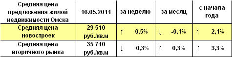 В Омске цены на жилую недвижимость практически стоят на месте. Еженедельные изменения стоимости - то повышение, то понижение - несущественны. На 16 мая 2011 года омская новостройка стоит в среднем 29 тысяч 510 рублей (+/-120) за квадратный метр, "вторичка" – 35 тысяч 740 рублей (+/-140).