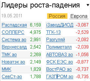 Фаворитом дня в четверг стали бумаги "Распадской" (+6,2%), выросшие на новости о возможной продаже 40%-ной доли Группы "Евраз" в угольной компании. Вероятным покупателем названа "Северсталь", котировки которой выросли за сессию на 1,8% благодаря позитивной отчетности за первый квартал. Кроме того, сегодня агентство Fitch Ratings подняло кредитные рейтинги трех российских металлургических компаний - "Северстали", ММК и НЛМК. Это отразилось в их росте ММК (+1,8%), НЛМК (+1,6%). Из металлургов отличились также акции ТМК (+2,3%). Хороший рост в четверг продемонстрировали и бумаги нефтегазового сектора "Газпром нефть" (+1,5%), "ЛУКОЙЛ" (+0,1%), "Роснефть" (+1%), "Сургутнефтегаз" (+0,8%). Акции "Газпрома" торговавшиеся всю сессию в плюсе, в последний час ушли в "красную" зону, снизившись на 0,7%. Хуже рынка выглядели также акции "Полиметалла" (-2%), "ФСК ЕЭС" (- 0,8%) и "АВТОВАЗа" (-1%).
