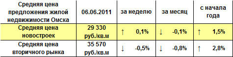 К июню количество агентств на омском рынке недвижимости превысило 500 фирм, а объем предложения достиг 17,5 тысячи вариантов квартир. В результате обработки всех предложений на 6 июня 2011 года квадратный метр в новостройках стоит в среднем 29 тысяч 330 рублей (+/-120), на вторичном рынке – 35 тысяч 570 рублей (+/-140).