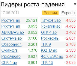 По итогам пятничных торгов индекс ММВБ закрылся на отметке 1645.82 пункта (-1,5%), индекс РТС потерял 0,96 % и достиг 1878.55 пункта. 17 июня на ММВБ курс доллара снизился на 7 копеек до 28,1322 рубля, евро вырос на 15 копеек до 39,9804 рубля. Стоимость бивалютной корзины выросла до 33,4703 рубля. В настоящий момент пара евро/доллар достигла отметки 1.43.