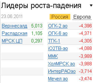 Долгое время давлению продаж сопротивлялись акции "Аэрофлота", которые поддерживались новостью о том, компания была признана лучшим авиаперевозчиком Восточной Европы в 2011 года на церемонии вручения ежегодной премии World Airline Awards в рамках Paris Air Show Le Bourget. Однако под занавес торгов котировки "обвалились" до общерыночных уровней. Против рынка росли бумаги "Распадской" (+1%) на фоне заявления "Евраза" о возможном обмене облигаций на обыкновенные акции.