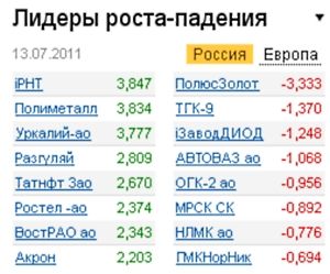Российский рынок утром в среду открылся умеренными покупками. Позитивное начало дня можно было объяснить подросшими за ночь котировками нефти на фоне подешевевшего доллара на Forex. Хорошие новости утром пришли из Азии: данные темпов роста промпроизводства в Китае намного превысили прогнозы аналитиков. Вкупе с информацией из протоколов заявления ФРС США о возможности продолжения политики количественного смягчения во вторник, это событие смогло на время отвлечь участников рынка от европейской долговой ямы. С другой стороны, "итальянский шок" в начале недели отнял много сил и нервов у всех спекулянтов, и реакция на понижение рейтинга Ирландии оказалась несколько заторможенной. 13 июля глава Банка Италии Марио Драги заявил, что европейский долговой кризис вступил в новую фазу и посоветовал регуляторам как можно быстрее выработать ясное решение долговых проблем. Понимание же глубины тех самых долговых проблем инвесторы надеются получить в пятницу с результатами стресс-тестов европейских банков.
