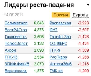 Утро 14 июля встретило российских инвесторов неприятным сюрпризом от агентства Moody’s, которое понизило кредитный рейтинг Соединенных Штатов. Сперва данная но-вость прошла катком по заокеанским площадкам, следом за ними подобную участь разделили рынки Азии, и, конечно, на подобном внешнем фоне отечественные биржи не преминули открыться с ощутимым "гэпом" вниз. Еще одним поводом для расстройств, правда, более локальным, стало опровержение слухов о покупке 80% акций "Распадской" ВЭБом, которые накануне здорово помогли вырваться вперед акциям угледобывающего предприятия.