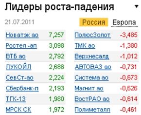 Хороший рост показали бумаги "нефтянки", "Ростелекома" (+0,55%) и "НОВАТЭКа"(+7,26%). Аналитик "АТОН" Елена Кожухова отмечает, что поддержку акциям "Ростелекома" оказывает просочившееся информация о возможной приватизации компании, однако акции крайне близки к перекупленности. Аналитик ИГ "Норд-Капитал" Виталий Манжос считает, что бумаги "НОВАТЭКа" продолжают расти благодаря сообщению об одобрении правительственной комиссией сделки по приобретению французской Total 20.5% в ОАО "Ямал СПГ", которое и контролируется "НОВАТЭКом". Лидером падения, как и минувшие дни, стали акции "Полюс Золото" (-3,49%) в связи с выбытием из базы расчета индекса MICEX M&M. Рост "Роснефти" (+1,09%) помимо высоких цен на сырье, по мнению аналитика ГК "АЛОР" Светланы Корзеневой, обеспечен информацией о том, что госкомпания ведет переговоры о покупке "Черноморнефтегаза".