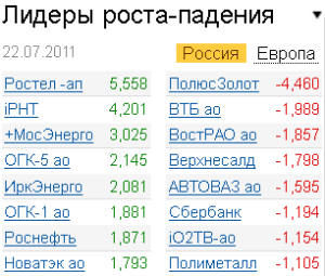 К полудню на рынке возобладали продажи: позитив из Европы был отыгран, а новых идей для роста не появилось. Иван Фоменко, заместитель начальника отдела доверительного управления "Абсолют Банка", считает, что причиной этого является и фактор пятницы, и желание зафиксировать прибыль, и отсутствие притока денег западных фондов. Как итог, к завершению торгов российский рынок остановился у нулевых отметок: индекс ММВБ закрылся на отметке 1728.84 пункта, упав на 0,009%, индекс РТС по итогам основной сессии пятницы вырос на 0,22% до 1976.82 пунктов.