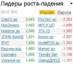 В лидерах сегодня оказались акции "Северстали" (+3,5%), продолжившие расти на позитивной отчетности, и "НОВАТЭКа" (+2%), возвращающиеся после коррекции к завоеванным максимумам. Значительно хуже рынка выглядели акции "Ростелекома" (-2,3%), которые снижались сразу на нескольких новостях, в частности, требовании АСВ к государству выкупить принадлежащие ему 4,7% пакет акций "Ростелекома" по 230 рублей за акцию. Кроме того, аутсайдерами четверга можно назвать "Белон" (-1,3%), "Холдинг МРСК" (-1,3), "Татнефть" (-1,2%).