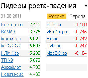 В итоге индекс ММВБ закрылся на отметке 1546,05 пункта, прибавив 2,39%, индекс РТС в плюсе на 2,36%, подтянувшись до уровня 1702,28 пункта. "Впереди планеты всей" умчались акции "Ростелекома" (+7,4%), которые хватали как горячие пирожки на включении их в индекс MSСI. Хороший результат показывают "металлурги" НЛМК (+5,2%) и ТМК (+4,3%). Неплохой рост в течение дня был в акциях "ЛУКОЙЛа", благодаря хорошей отчетности за 1 полугодие по US GAAP, но под занавес игроки стали фиксировать прибыль (+0,6%). Лучше рынка торговались также бумаги "КАМАЗа" (+6,7%), "Магнита" (+5,9%), "НОВАТЭКа" (+4,4%), "Норникеля" (+2,9%). У последнего, по мнению аналитика ГК "АЛОР" Натальи Лесиной, целых два драйвера для роста: кроме дорогой оферты "РУСАЛу", акции толкают вверх новости о предполагаемой приватизация 14,8% "ИнтерРАО" до 2015 года. ГМК "Норникель" владеет 14,2% данной компании. Причем SPO энергетической компании запланировано на ближайшие два года с доступом к торгам в Лондоне.