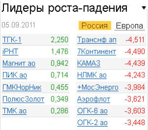 В течение дня спекулятивная игра на повышение наблюдалась в "Ростелекоме", однако к финалу торгов все достижения были растеряны (-1,6%). В лидерах роста пребывали акции ТГК-1 (+2,25%) благодаря хорошей отчетности за первое полугодие 2011 года.