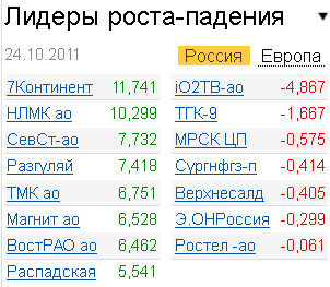В понедельник наблюдалось укрепление рубля по отношению к доллару, бивалютной корзине и евро. Цены на "черное золото" росли. Однако волатильность цен на сырье, как отмечает аналитик ГК "АЛОР" Наталья Лесина, негативно повлияла на акции нефтегазового сектора, которые в целом отставали от российских индексов. Декабрьские фьючерсы на нефть марки Brent находятся на отметке $111.127 за баррель, Light - $90.54 за баррель. Причиной может выступать как возможность санкций против Сирии в рамках продолжающегося конфликта в стране, так и заявление победивших в Ливии повстанцев о том, что законотворчество в государстве после сорока лет светского режима теперь будет строиться на шариатской системе. Трейдер УК "Альфа-Капитал" Наталья Забула отмечает, что как некогда прежде сами страны-экспортеры заинтересованы в повышенной экспортной выручки, ведь для сохранения власти требуется социальные расходы, иначе население может проявить недовольство.